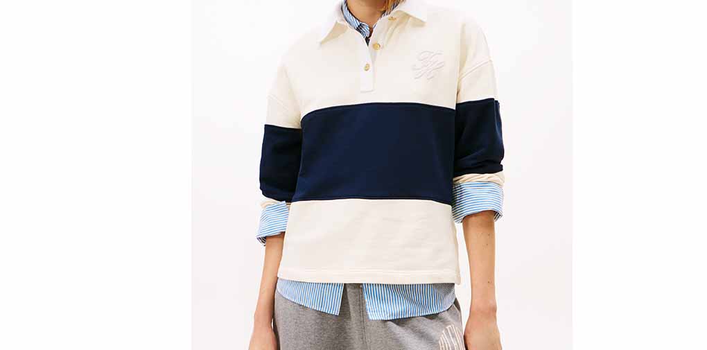 Next, the white cable-knit rugby shirt with gold buttons. I fell in love the second I saw it. Made from a soft cotton and recycled polyester blend, it feels like being wrapped in sunlight. The clean white base is so versatile—pair it with jeans, chinos, or even a skirt, and you’re instantly in that effortless American casual style. I love how it’s simple but not plain—every detail, from the gold buttons to the subtle stitching, shows the brand’s commitment to quality. I wore it to a café last week, and a girl walked up and asked, “Is that a TOMMY HILFIGER shirt? It’s so cool!” I nodded with a grin—TOMMY HILFIGER, you really know how to make a statement with just one piece.